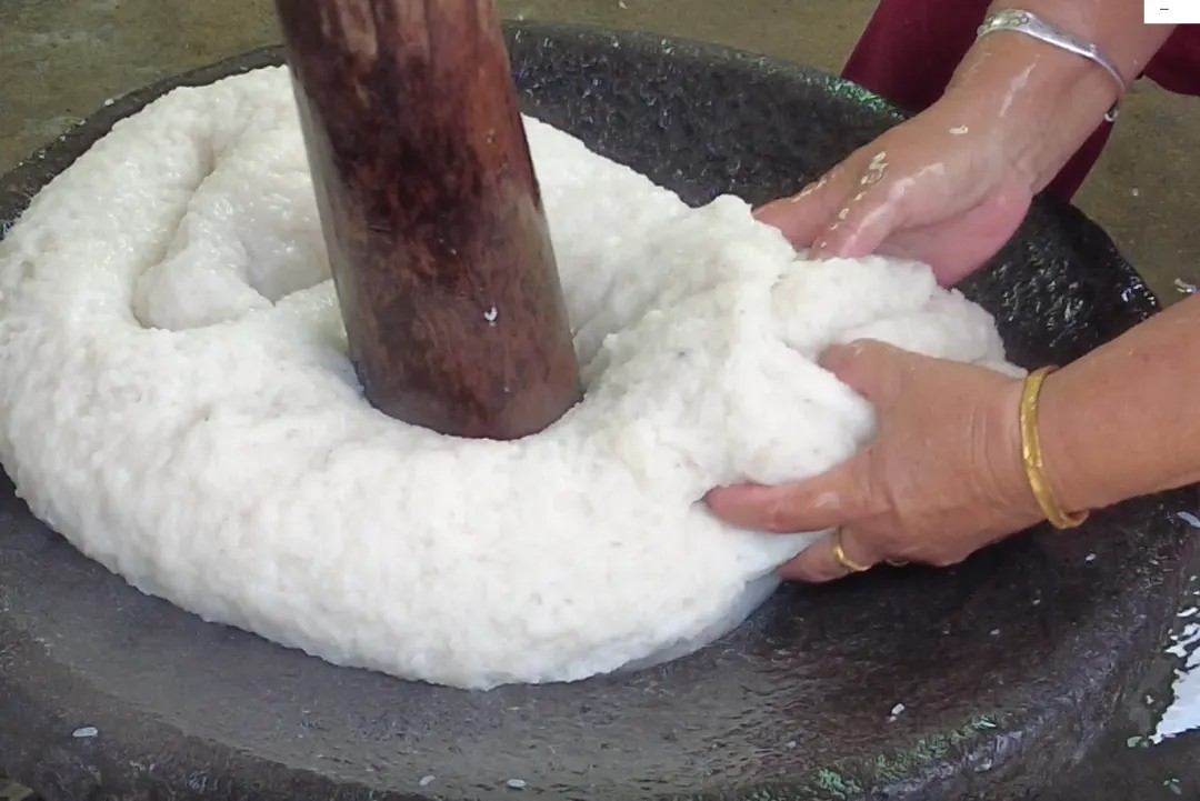 出锅!蒸汽扑面而来,伴随着糯米香,那一笼糯米出炉了,被甩到了石臼上。蔡婶说,石臼年代久远,早已说不清来历,算得上百年的老物件了。说着,蔡婶和蔡叔两个人就默契地舂糍粑,“嘭、嘭....。。”一个用粗木杵,在万宁也称“将手”,或叫“舂杵”,把蒸好的糯米敲烂,一个不停手蘸凉水翻糯米粑,一直敲打到软烂,这样的糯米粑才更有弹劲。