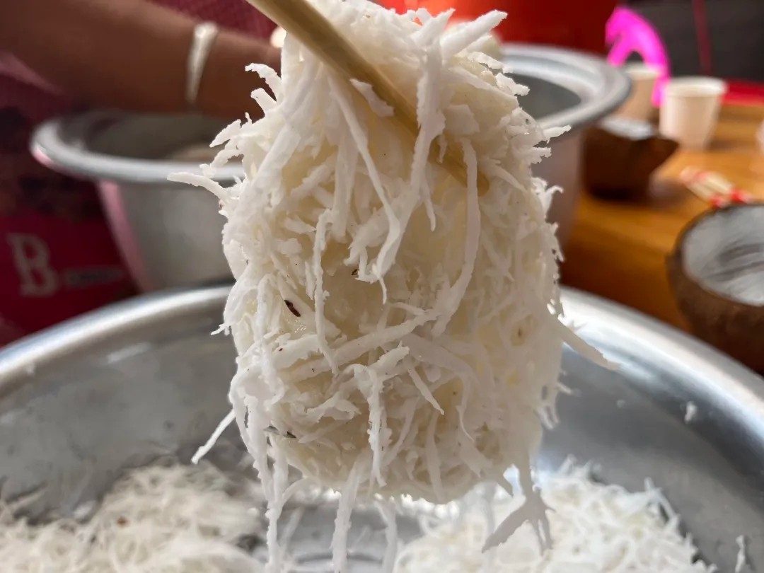 “趁热吃,用手抓着吃才更香呢。” 蔡家小儿子热情招呼众人围坐下来,大伙儿纷纷夹起软糯的糯米粑往嘴边送,有说有笑。曾经,制作椰丝糯米粑是蔡家补贴生计的谋生本事,如今,生活日渐安稳宽裕,这一味糯香,化作了维系亲情友情的暖心纽带。