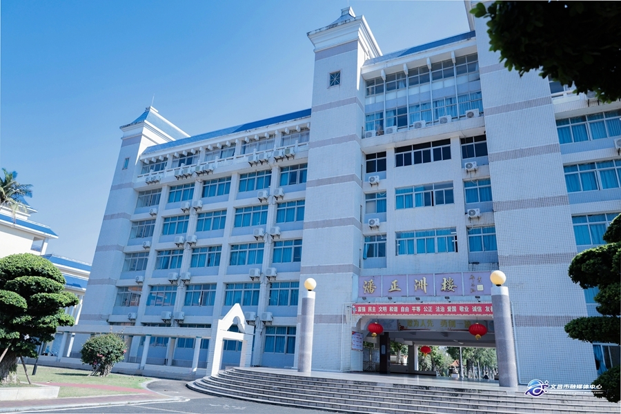 文昌市融媒体中心记者王逍:“走在文昌中学的校园里,你会发现,很多教学楼都是以人名命名的。而这些名字,大多都来自心系家乡的侨胞和港澳同胞。我身后的这栋教学楼——潘正洲楼,就是由香港同胞潘正洲先生捐资320万元兴建。一份桑梓情深,一份助学善举,让这座教学楼拔地而起,也为家乡的学子们撑起了一片求知成才的天地。”