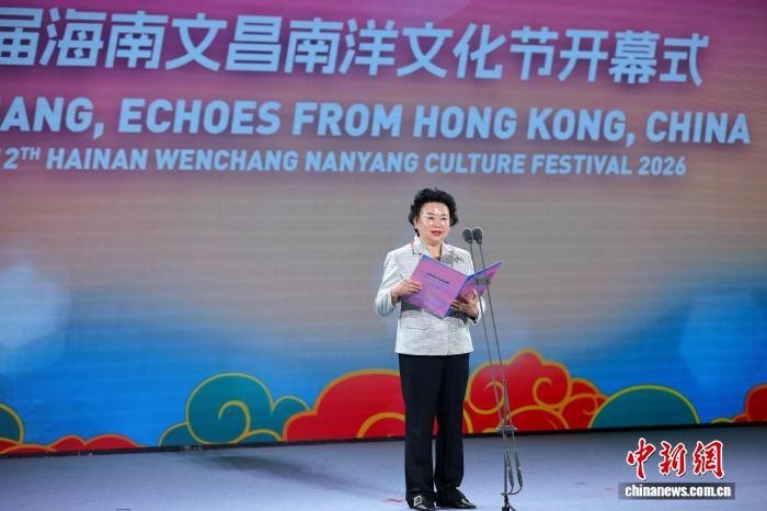4月3日,2026年第十二届海南文昌南洋文化节开幕,香港文昌社团联会(香港文昌同乡会)会长陈爱玲致辞。中新网记者 骆云飞 摄