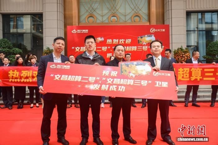 2022年1月,“文昌超算二号”、“文昌超算三号”卫星抵达海口,邢诒川带领企业团队预祝发射成功。海南现代科技集团供图