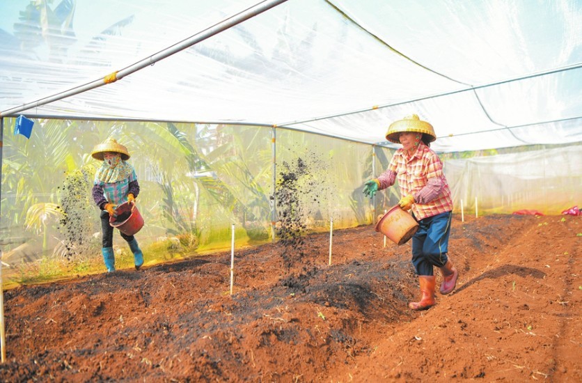 近日,在海南琼山蔬菜科技小院的蔬菜大棚内,农户正在施有机肥。本报记者 苏弼坤 摄