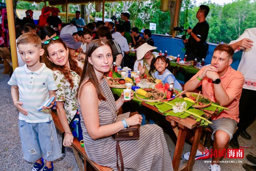 4月11日,三亚市育才生态区举办“锦绣育才·潮涌自贸——‘三月三’共绘封关新画卷”主题活动。图为外籍游客体验长桌宴。(三亚市育才生态区管委会 供图)