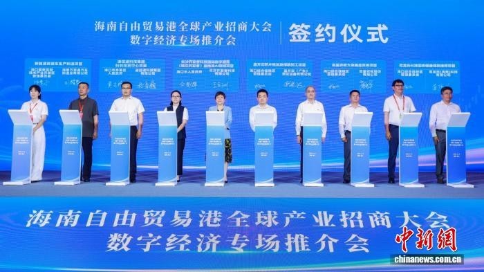 4月14日,海南自由贸易港全球产业招商大会数字经济专场推介会在海口举办,图为签约仪式。中新网记者 王子谦 摄