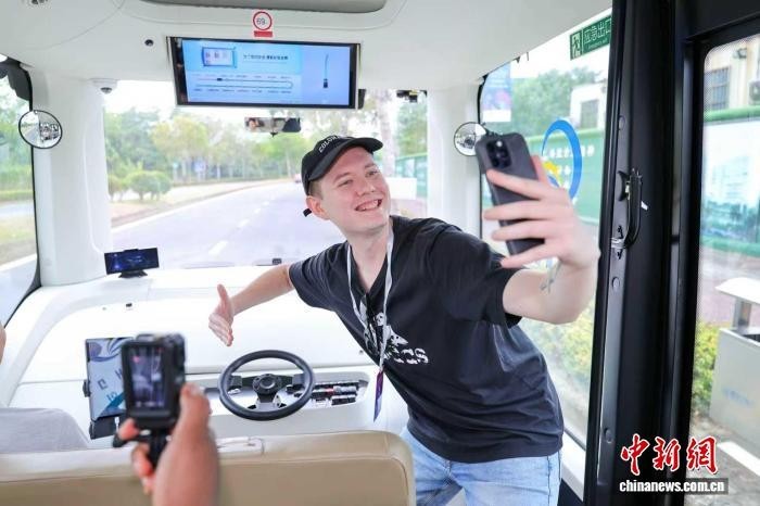 4月15日,俄罗斯籍博主安特在海南博鳌乐城国际医疗旅游先行区乘坐无人驾驶车辆。 中新网记者 骆云飞 摄