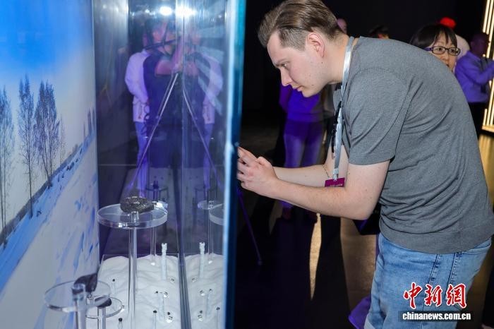 4月15日,俄罗斯籍博主安特走进海南文昌极星陨石博物馆,拍摄陨石标本。 中新网记者 骆云飞 摄