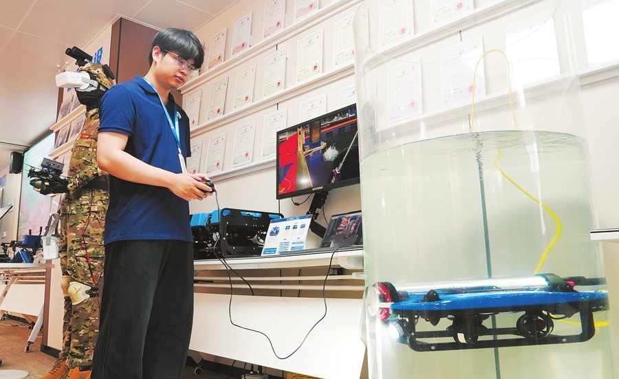 话音刚落,现场技术人员立刻上前,弯腰接通控制设备电源,手指快速调试参数、点击启动按钮。伴随轻微的嗡鸣,这款水下机器人缓缓启动,在模拟水池中灵活地完成上浮、下潜、转向等一系列动作,姿态流畅、精准可控,现代化科技创新的硬实力生动具体地呈现在眼前。