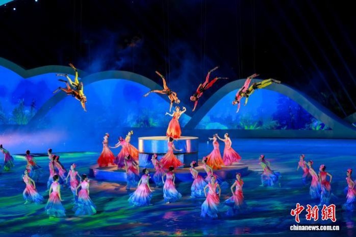 4月22日,第六届亚洲沙滩运动会开幕式在海南三亚举行。开幕式上的文艺表演以诗意视觉诠释海南海洋文化。 中新网记者 贾天勇 摄