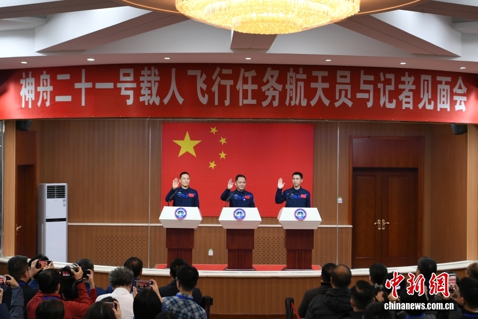 10月30日,神舟二十一号乘组3名航天员在酒泉卫星发射中心问天阁与中外媒体记者集体见面。