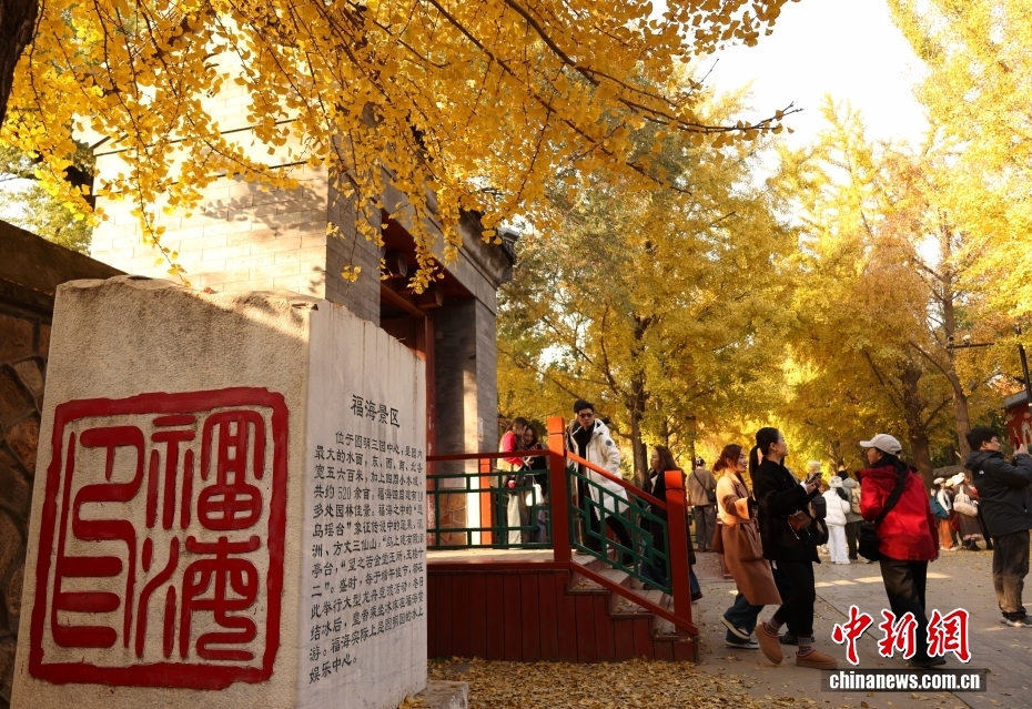 11月3日,游客在北京圆明园遗址公园踏秋赏景。眼下,圆明园的近千米银杏大道已进入最佳观赏期,吸引众多游人前来打卡拍摄。