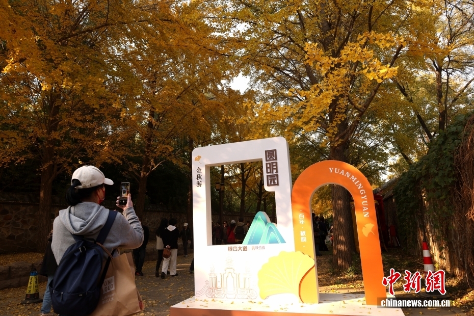 11月3日,游客在北京圆明园遗址公园踏秋赏景。眼下,圆明园的近千米银杏大道已进入最佳观赏期,吸引众多游人前来打卡拍摄。