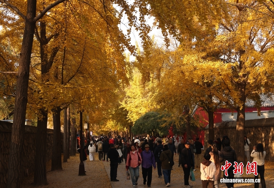 11月3日,游客在北京圆明园遗址公园踏秋赏景。眼下,圆明园的近千米银杏大道已进入最佳观赏期,吸引众多游人前来打卡拍摄。