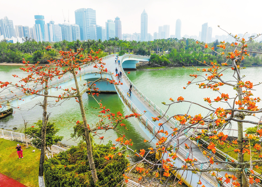 海口湾龙珠桥旁木棉竞艳春意浓