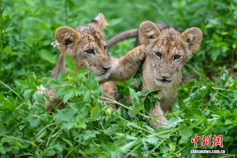 海南海口:两月龄非洲狮兄妹首秀萌翻游客